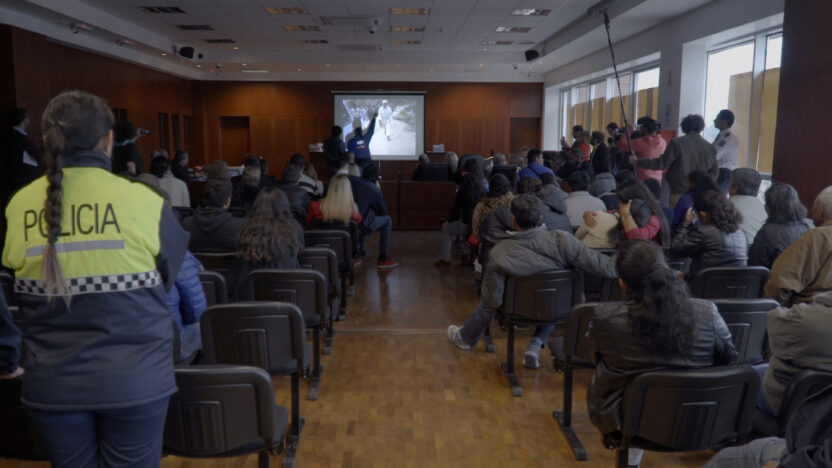 Me he preguntado varias veces por la elección de este inicio. Es una decisión política y estética. Martel parece oscilar entre la distinción entre tierra como territorio y Tierra como planeta, así que lo que desarrolla a lo largo del film es una tesis sobre ese desplazamiento. Martel deshace este lugar del inicio para aceptar la idea de la tierra como espacio socialmente organizado y políticamente disputado, lejos de verla como una entidad biofísica única. Con esta decisión, Martel propone una ruptura con esta lejanía y nos envía a un aterrizaje. A partir del sonado caso del asesinato del líder comunitario e indígena Javier Chocobar, la cineasta argentina emprende una reconstrucción de los hechos desde los elementos clásicos del cine de juicios, como si el espectador del planeta universal tuviera que detenerse en una realidad que aún ocurre más allá de las estelas celestiales, donde no hay ruido y solo una aparente paz que quizás solo aprecien los astronautas.